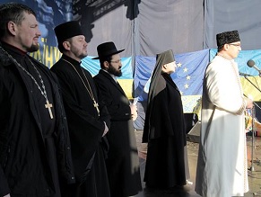 On photo in the middle: Dov-Ber Glikman in the hospital, January 18; on lower photo: joint Jewish, Christian, and Muslim prayer for peace at Maidan, December 29.